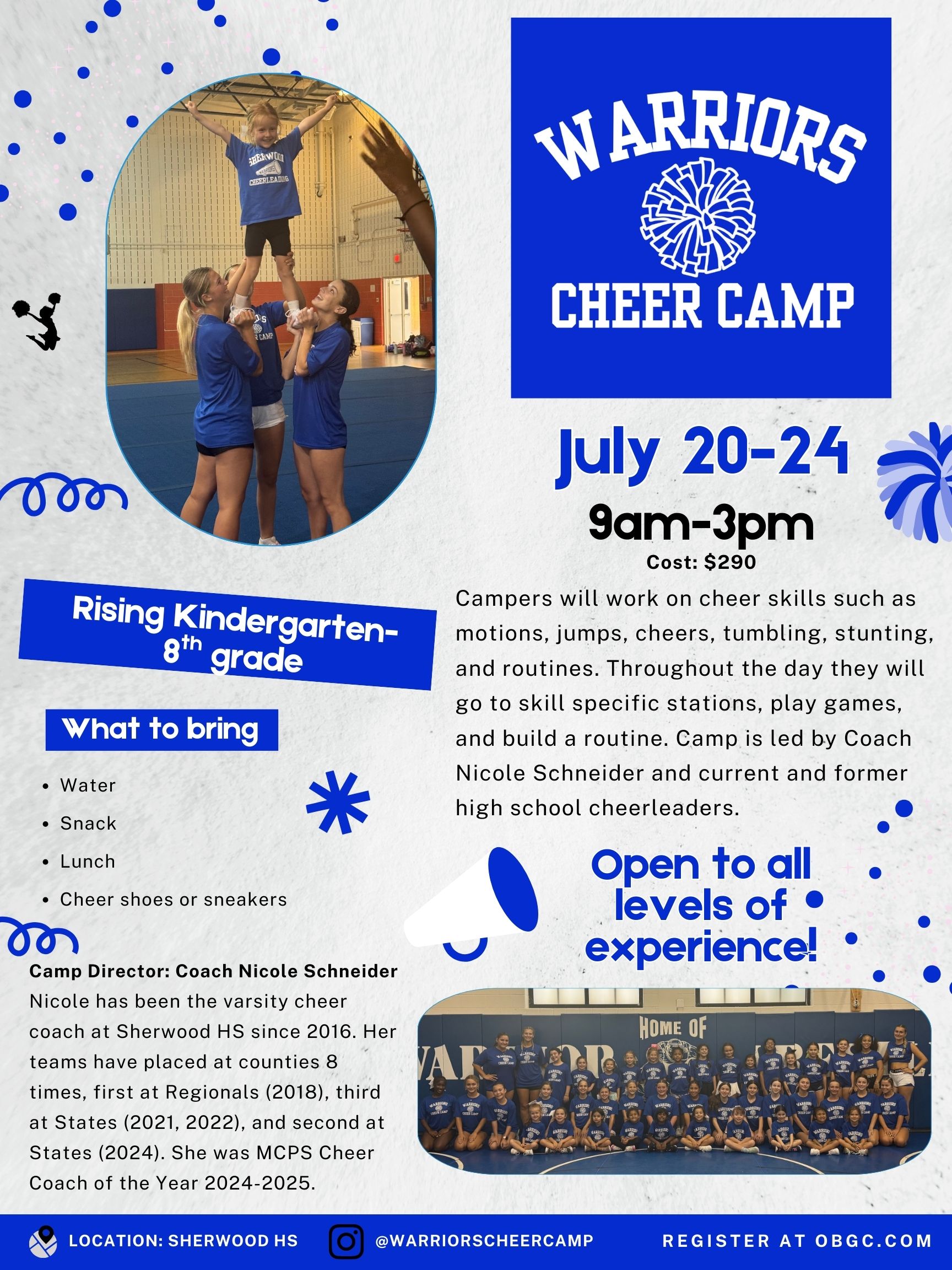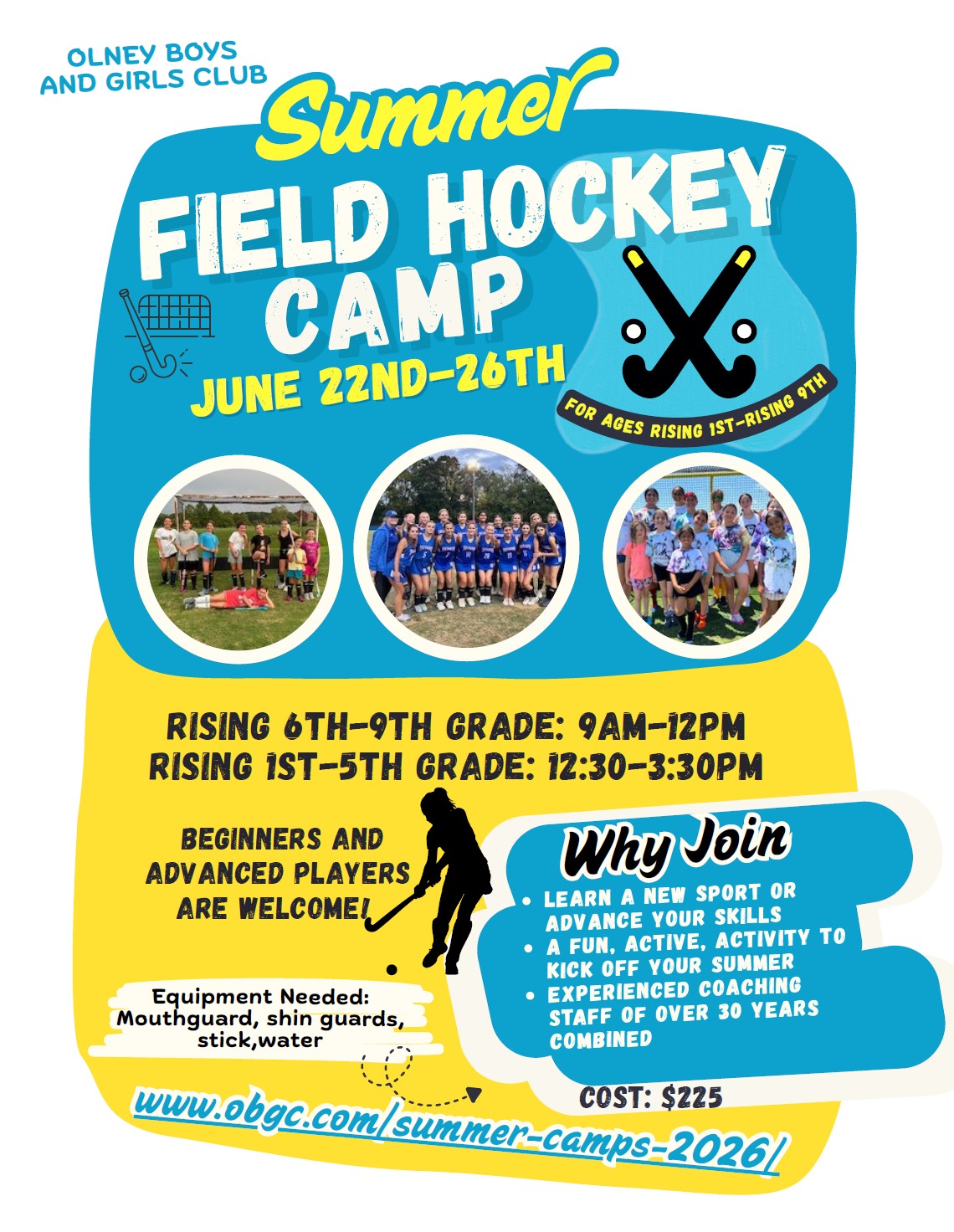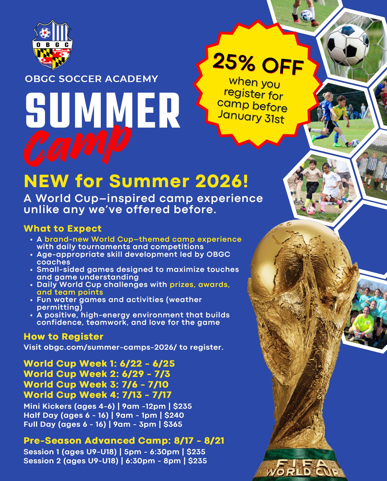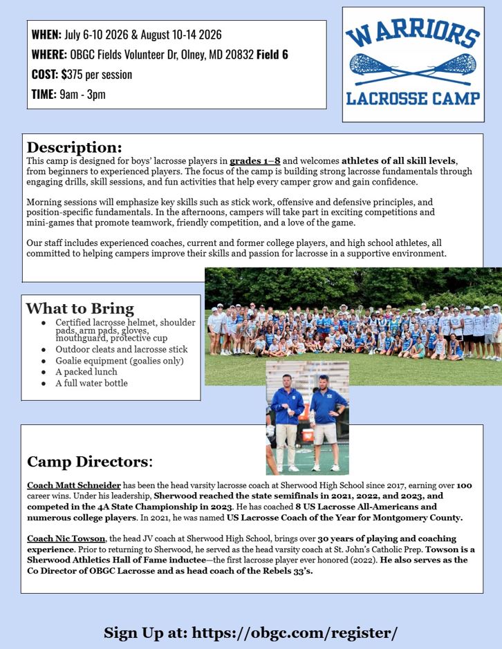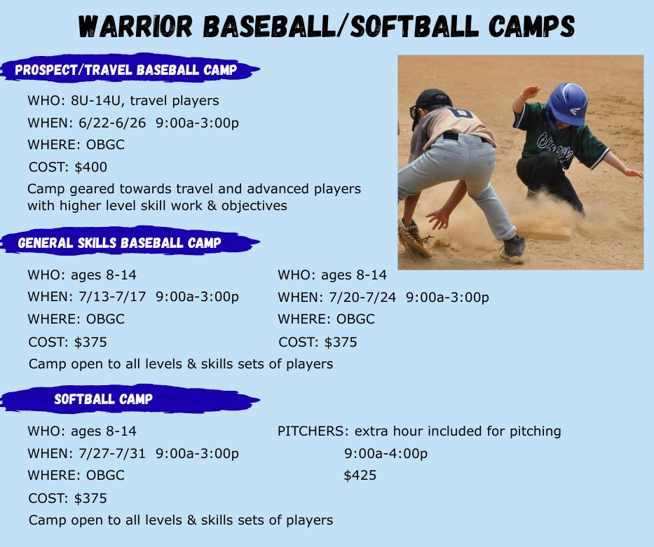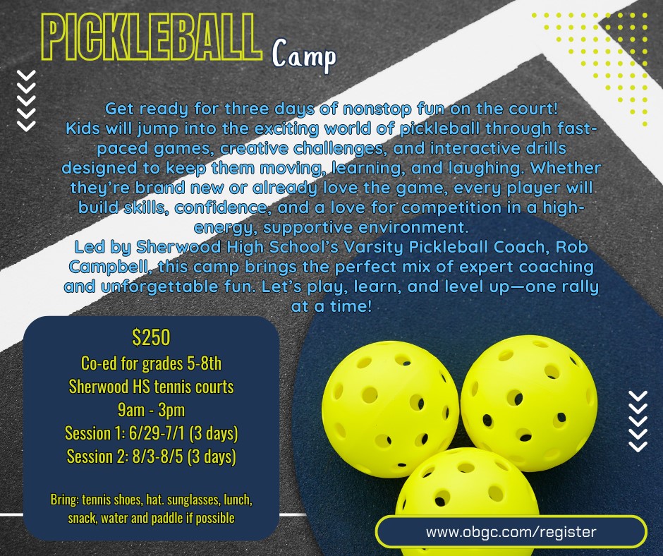Registrations are done online and processed on a first come, first-served basis. A non-refundable deposit of $25 is included in the pricing of all camps. Any changes or cancellations must be sent to obgcadm@obgc.com for processing.